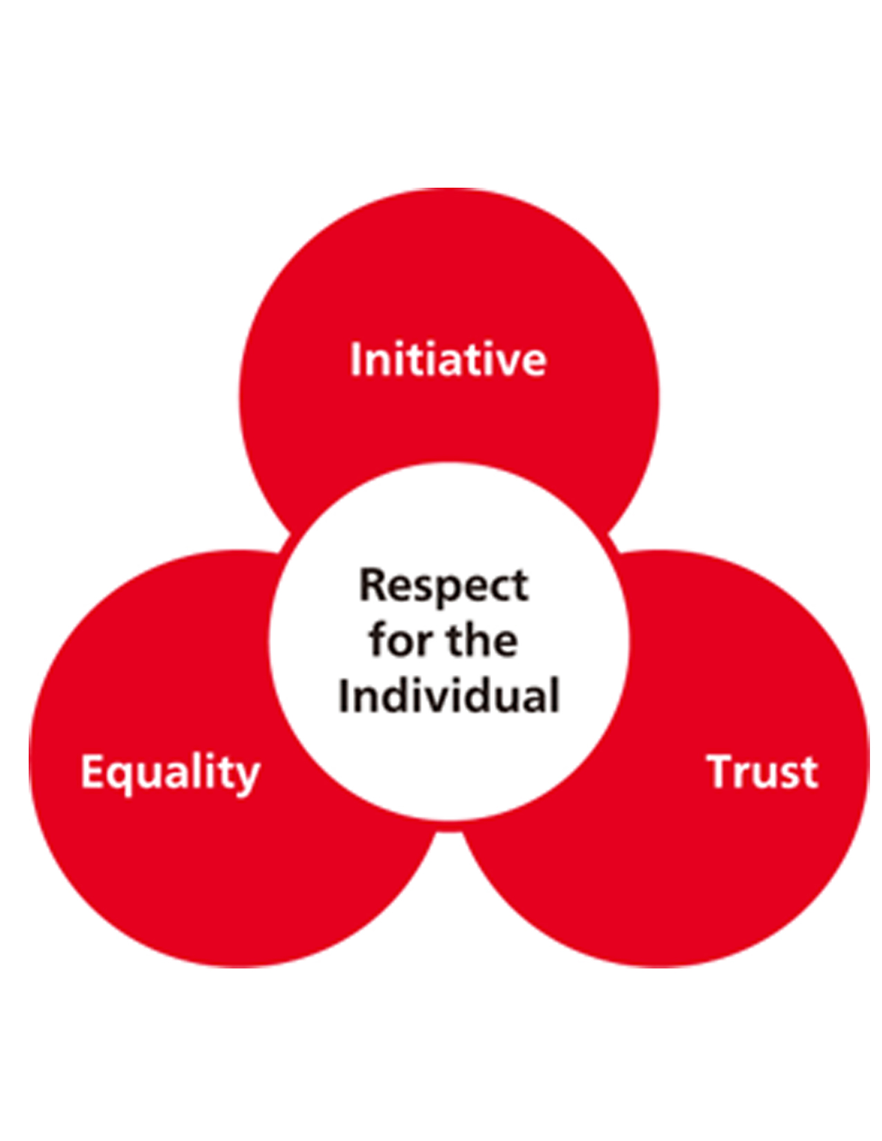 The relationship among associates at Honda should be based on mutual trust. Trust is created by recognizing each other as individuals, helping out where others are deficient, accepting help where we are deficient, sharing our knowledge, and making a sincere effort to fulfill our responsibilities.